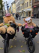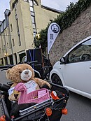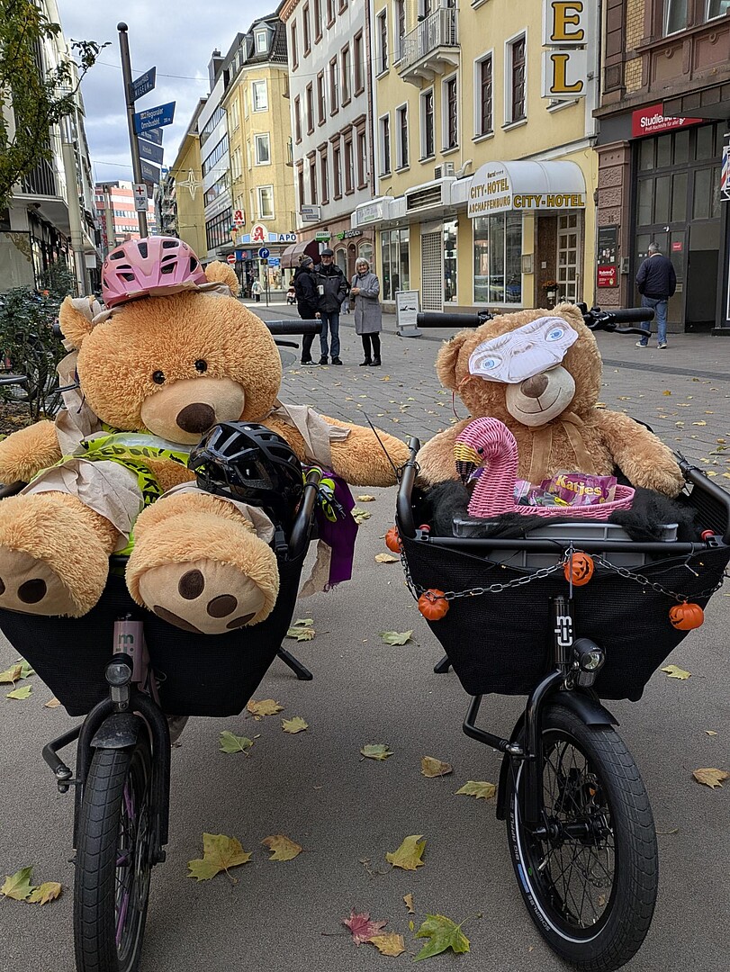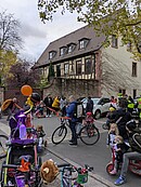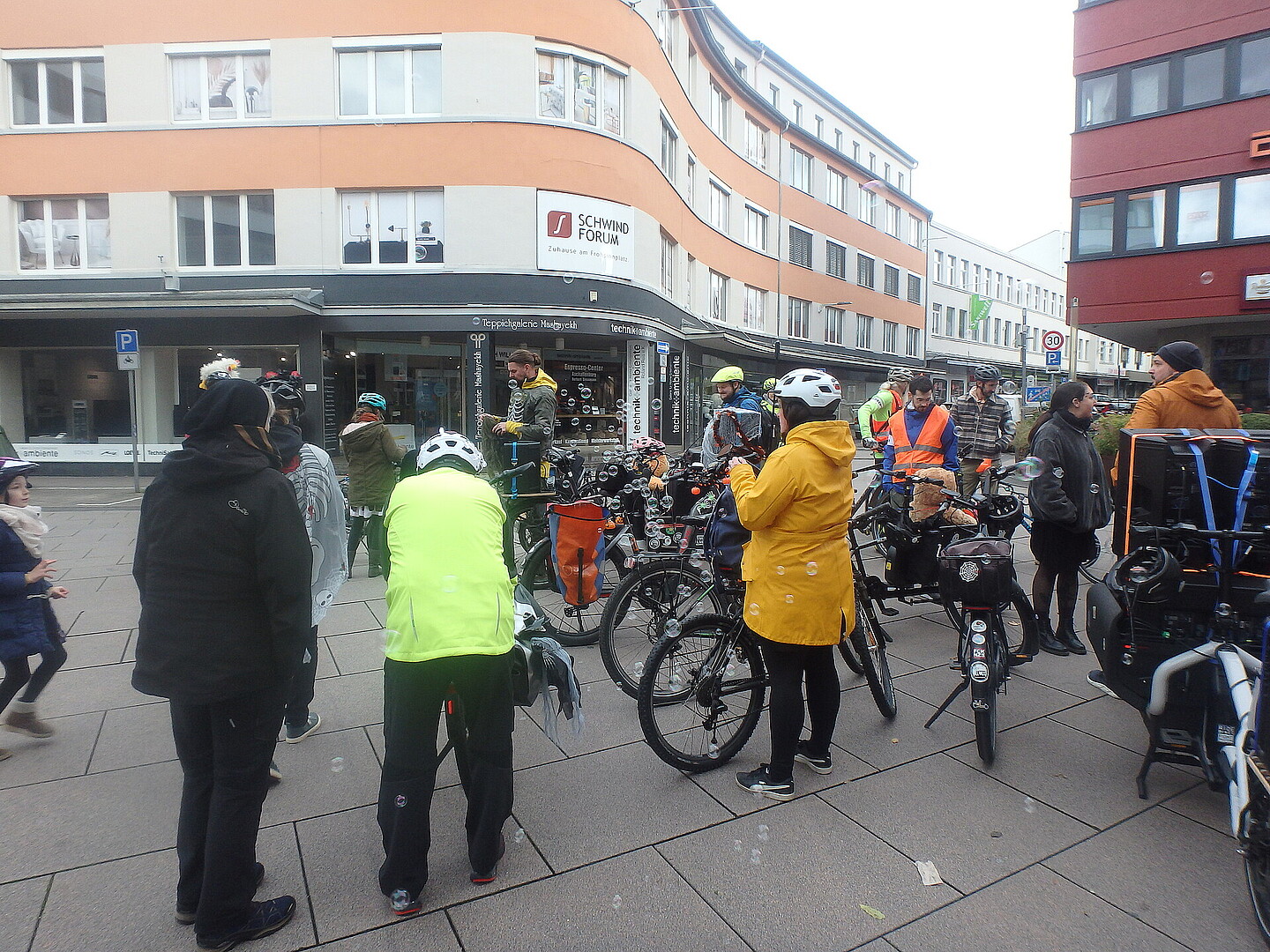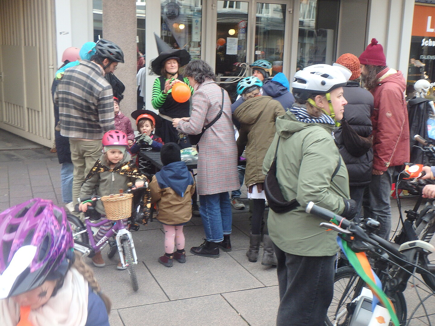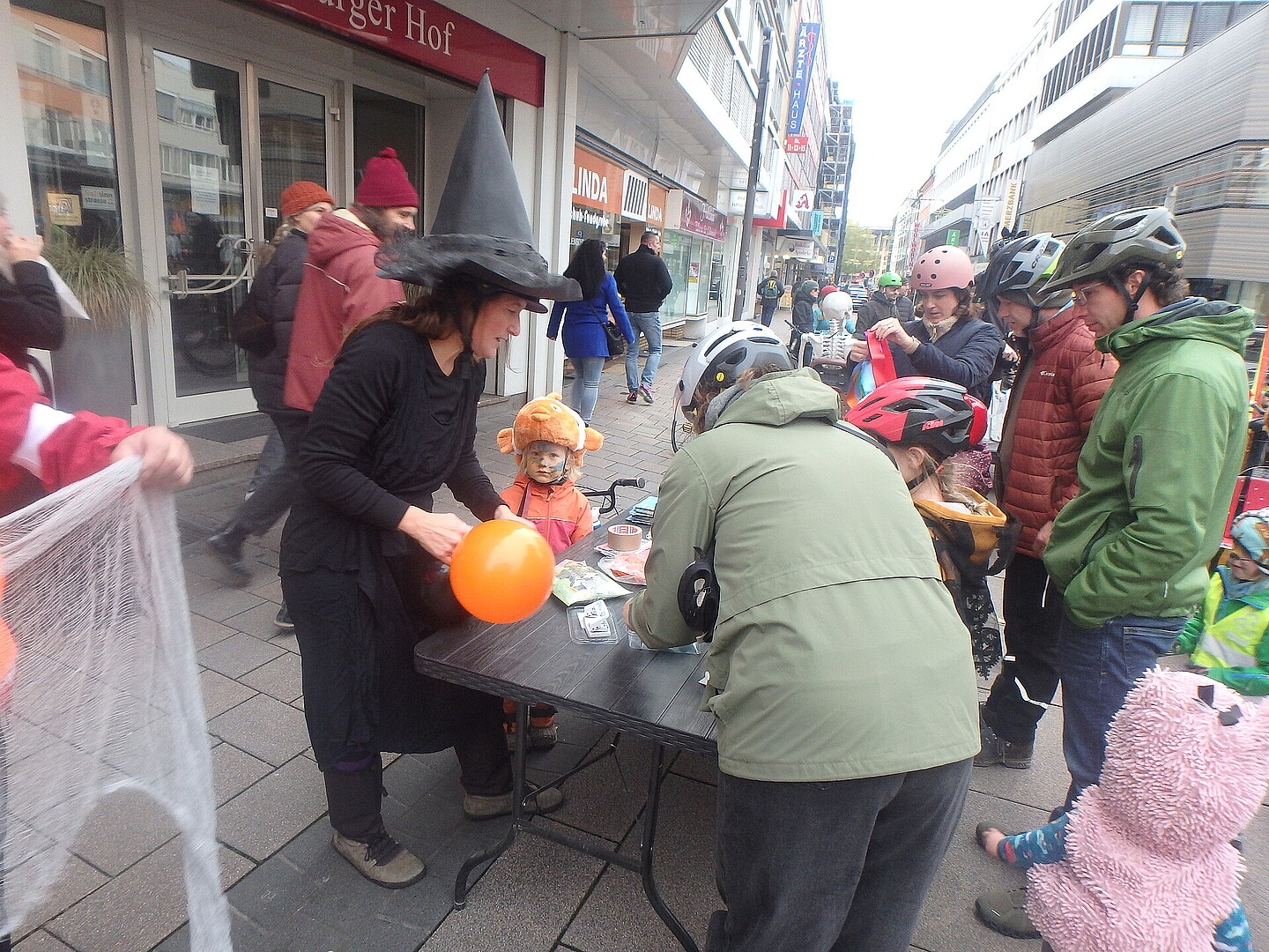 Eingeleitet wurde mit einer halbstündigen Zusammenkunft auf der Frohsinnstraße mit Soundbike aus welchem die Titelmelodien von „Halloween“ oder „Wednesday“ erschallten. Eine Hexe (Christine) verteilte Materialien an die Kinder, passend zum Wind gab es ADFC-Windrädchen und verschiedene andere Accessoires. Die Fahrräder waren oder wurden noch vor Ort bunt mit Skeletten, Plüschtieren, Kürbissen oder Leichentüchern geschmückt. Und die Seifenblasen wabert in die Frohsinnstraße, so dass wir um 15:30 Uhr durch die Innenstadt ziehen konnten. Erstmals wurde bei einer Kidical Mass auch der Tunnel am Landing in die Route einbezogen (bisher wegen Brandschutz etc. verweigert). Auf der Treibgasse am Wolfsthalplatz endete die Tour und es gab noch Raum für Gespräche und Spiele. Die Polizei hat super an der Veranstaltung mitgewirkt. Diejenigen am Wolfsthalplatz, welche mit ihren Karossen den Menschen den Raum wegnehmen bekamen erst mal einen Denkzettel (leider nur 10 Euro).