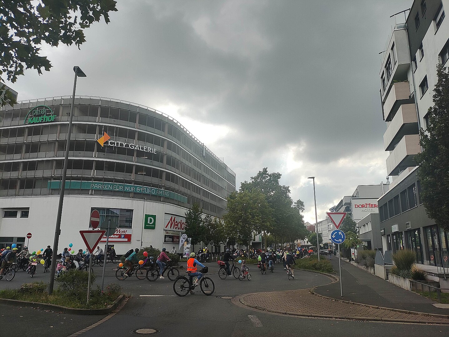 Auf der Luitpoldstraße konnten wir am 28. September vom ADFC zusammen mit VCD (Verkehrsclub Deutschland) und anderen Organisationen zahlreiche ganz junge Radfahrer*innen zur Kidical Mass begrüßen. Wir waren überwältigt von der hohen Anzahl von Teilnehmer*innen und insbesondere der vielen Kinder.