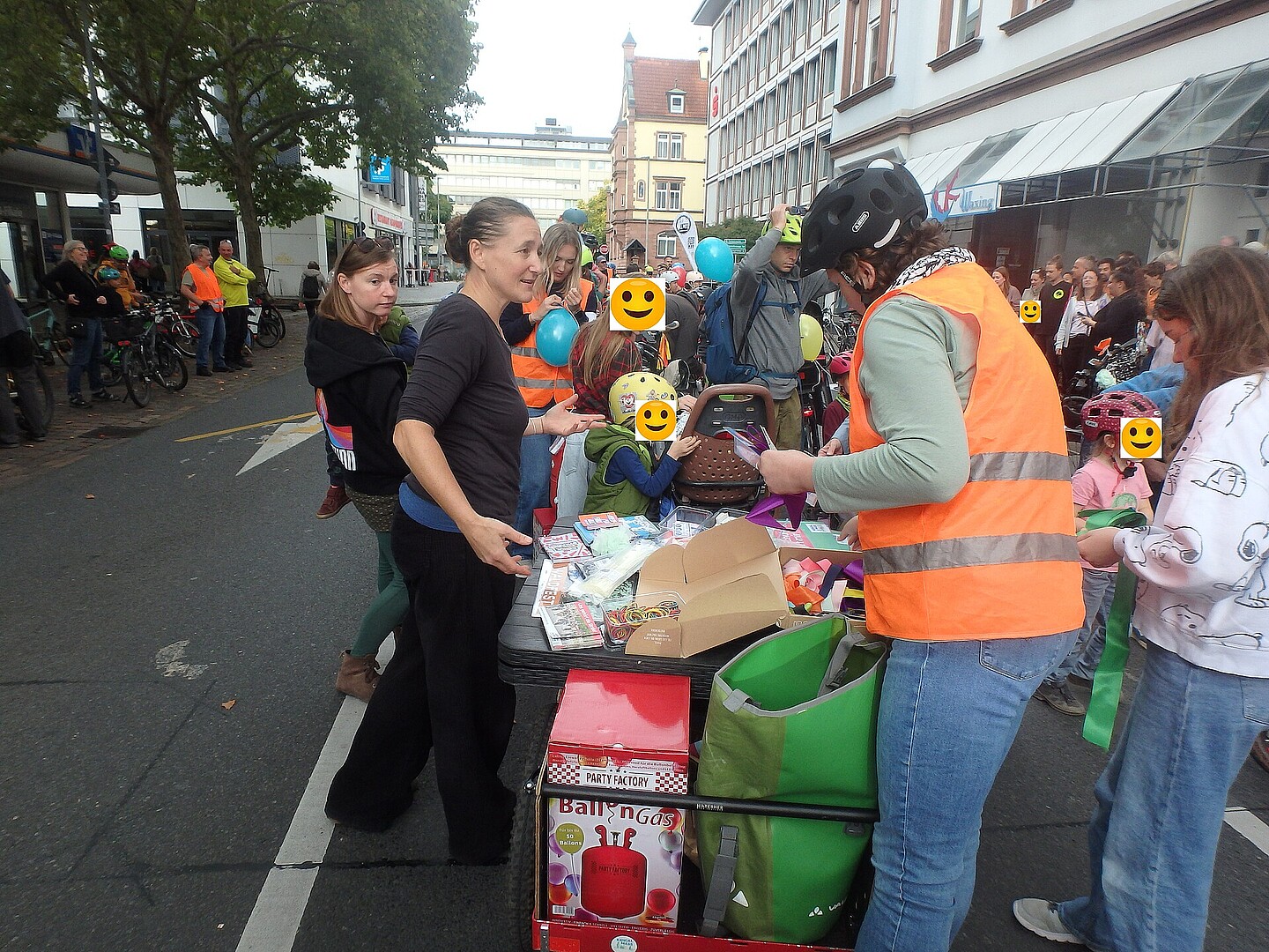 Begleitet wurde die Demoaufstellung von einem Auftritt des Aschaffenburger Kneipenchors. Mit einem mobilen Infostand vertreten gab es beim ADFC Luftballons, ADFC-Windrädchen und Kleinplakate fürs Fahrrad. Auch die Seifenblasenmaschine, Tattoos und Malbücher kamen gut bei den Kleinsten an. Christine Kunkel und Team waren fleissig dabei Luftballons aufzupumpen.Diesmal war es eine sehr bunte Fahrraddemo – etliche erwachsene Mitfahrer*innen hatten ihre Fahrräder entsprechend dem Anlass geschmückt. So geht gelebte Fahrradkultur!