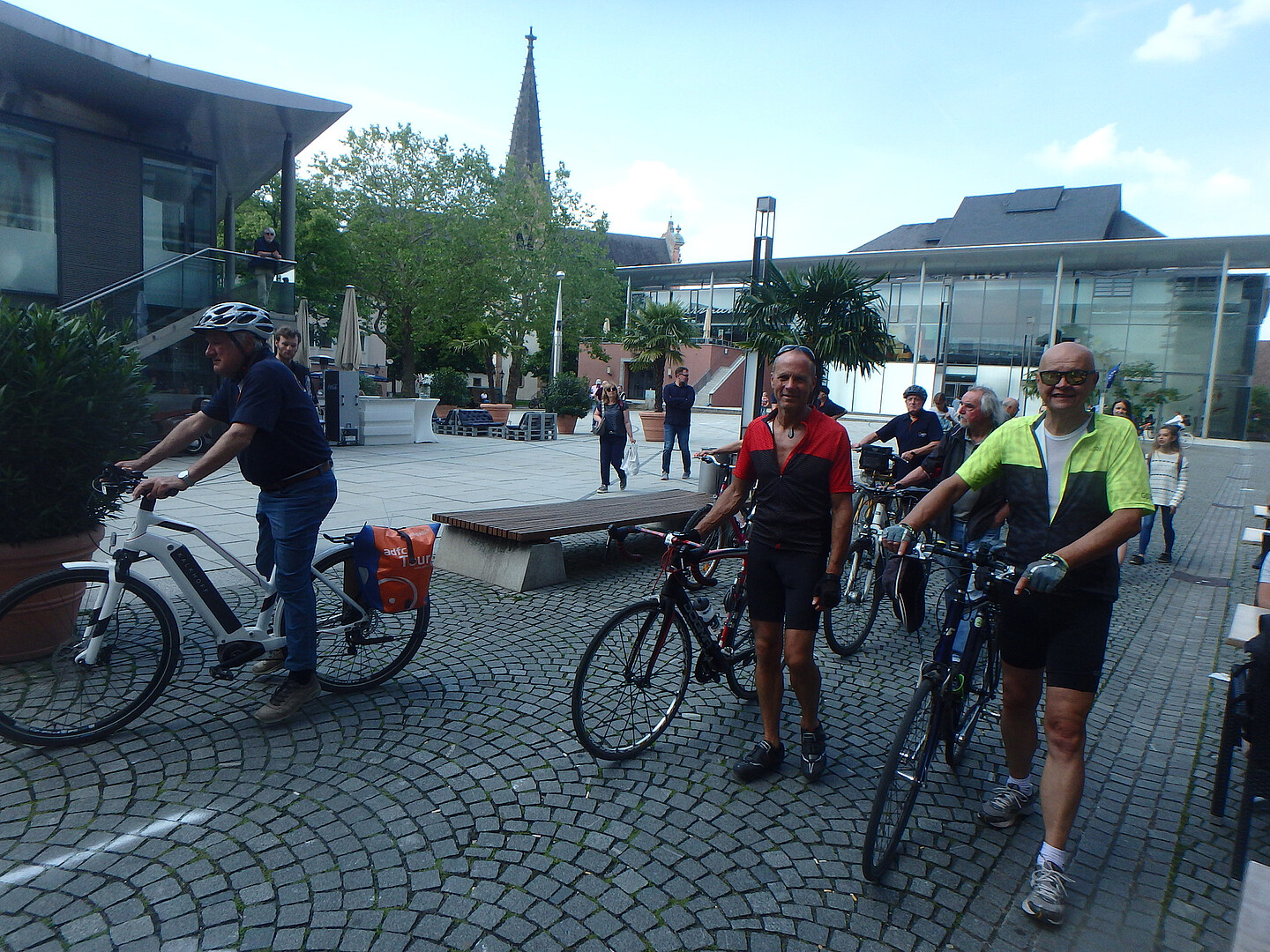 Fast 200 Radfahrer/innen sind am frühen Samstag von der Großmutterwiese zur IAA aufgebochen. Dort hatte sich auch die Ordnertruppe mit roten Laibchen formiert, der u.a. Horst Brandenburg und Tino Fleckenstein angehörten. Viele der Terilnehmer/innen kannten wir bereits aus der Stadt und dem Umland, es waren aber dort auch Erlangen, Nürnberg und Tübingen vertreten. Bereits in Mainaschaff und Kleinostheim wurden wir merklich mehr und sprengten in Kleinostheim bereits die 250er Grenze. Viele Passanten und AnwohnerInnen haben die Sternfahrt unterwegs erfreut aufgenommen und uns zugejubelt. Insbesondere in Offenbach standen hunderte Radfahrer, die jubelten und sich dann der Route anschlossen.