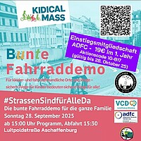Am Sonntag, den 28. September 2025, um 15 Uhr startet auf der Luitpoldstraße in Aschaffenburg die nächste Kidical Mass – eine bunte, familienfreundliche Fahrraddemo für kinder- und fahrradgerechte Straßen. Unter dem Motto „Straßen sind für alle da!“ setzen Kinder, Eltern und Engagierte ein starkes Zeichen für sichere Schulwege, geschützte Radinfrastruktur und lebenswerte Städte. Abfahrt ist um 15:30 Uhr. Die Kidical Mass ist Teil der bundesweiten Aktionstage, die vom 14. September bis 24. Oktober 2025 in über 200 Städten und Gemeinden statt-finden. In ganz Deutschland gehen tausende Menschen auf die Straße, um eine kindgerechte Verkehrswende einzufordern – getragen von einem breiten Bündnis aus Verbänden, Initiativen und engagierten Bürger*innen. Die Bewegung wächst von Jahr zu Jahr und zeigt eindrucksvoll: Sichere Mobilität für Kinder ist ein Thema, das überall Menschen bewegt. Diesmal sind einige Specials dabei, die diese Kidical Mass zu einer besonderen machen werden. Special Guest auf dem Marktplatz: Kneipenchor Aschaffenburg Die Route ist kindgerecht, abgesichert durch die Polizei und auch für die Kleinsten gut zu bewältigen. Mitradeln können alle – egal ob mit Laufrad, Lastenrad oder Citybike. Ziel und Abschlussaktion ist auf der Großmutterwiese. Die Kidical Mass ist ein starkes Zeichen dafür, dass auch Kinder das Recht auf sichere, selbstbestimmte Mobilität haben. Wir wollen zeigen, wie eine Stadt aussehen kann, in der sich alle mit dem Rad sicher fühlen – egal wie alt sie sind. Bringt aus Eurem Kreis Kinder und/oder Enkelkinder mit zu dieser Tour! |