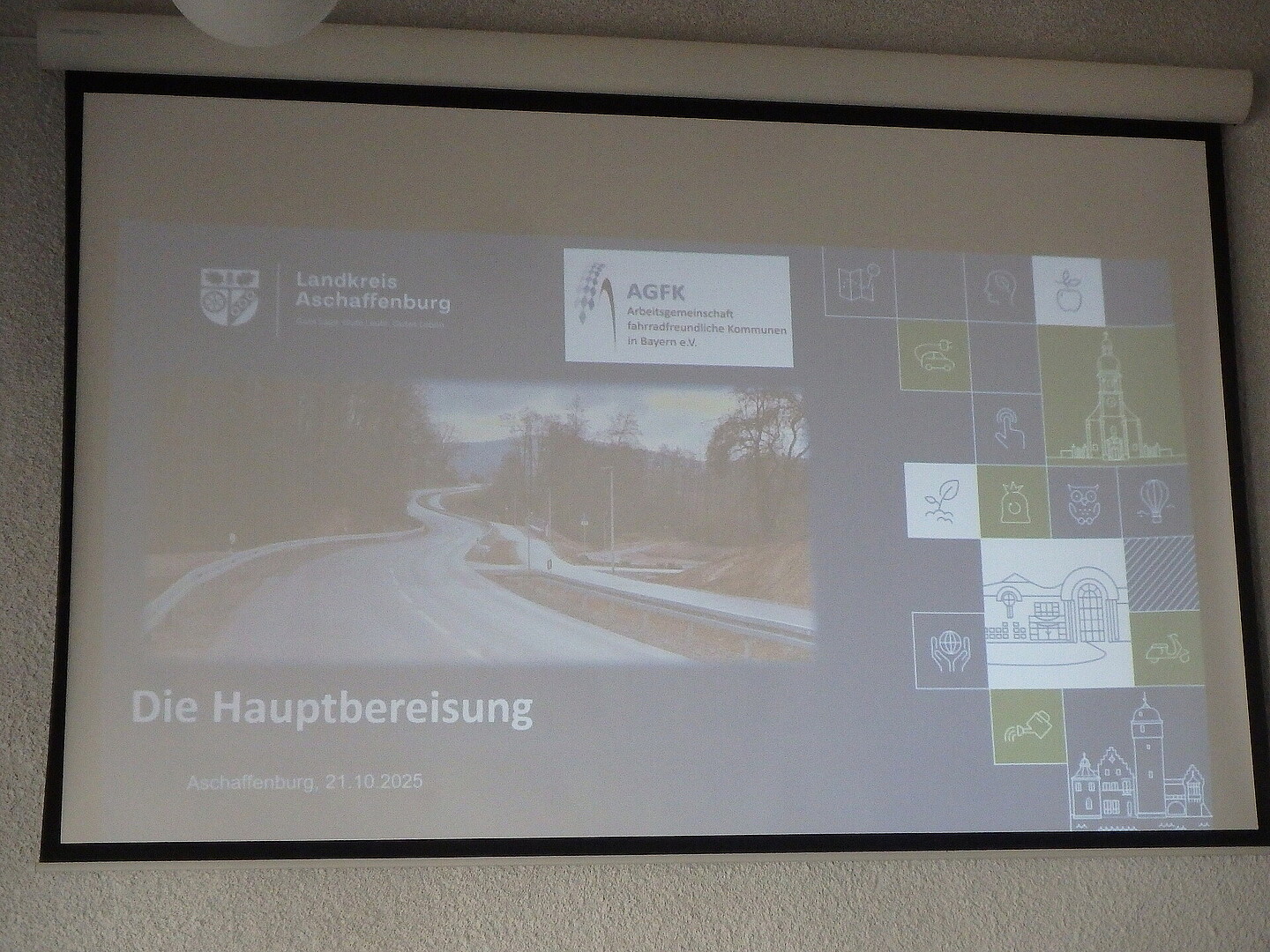 Am 21.10.2025 bereiste eine Kommission bestehend aus Vertretern der AGFK Bayern (Arbeitsgemeinschaft fahrradfreundlicher Kommunen Bayern e.V.), dem ADFC Bayern und dem Bayerischen Ministerium für Wohnen, Bauen und Verkehr den Landkreis Aschaffenburg. Nachdem im Oktober 2021 die Vorbereisung stattfand, sollte bei der Hauptbereisung geprüft werden, inwieweit der Landkreis Aschaffenburg die Auszeichnung „Fahrradfreundliche Kommune“ verdient. Im „Praxisteil“ wurde der Mainradweg zwischen Mainaschaff und Karlstein befahren und an mehreren Stationen Radverkehrsprojekte im Landkreis erörtert:
