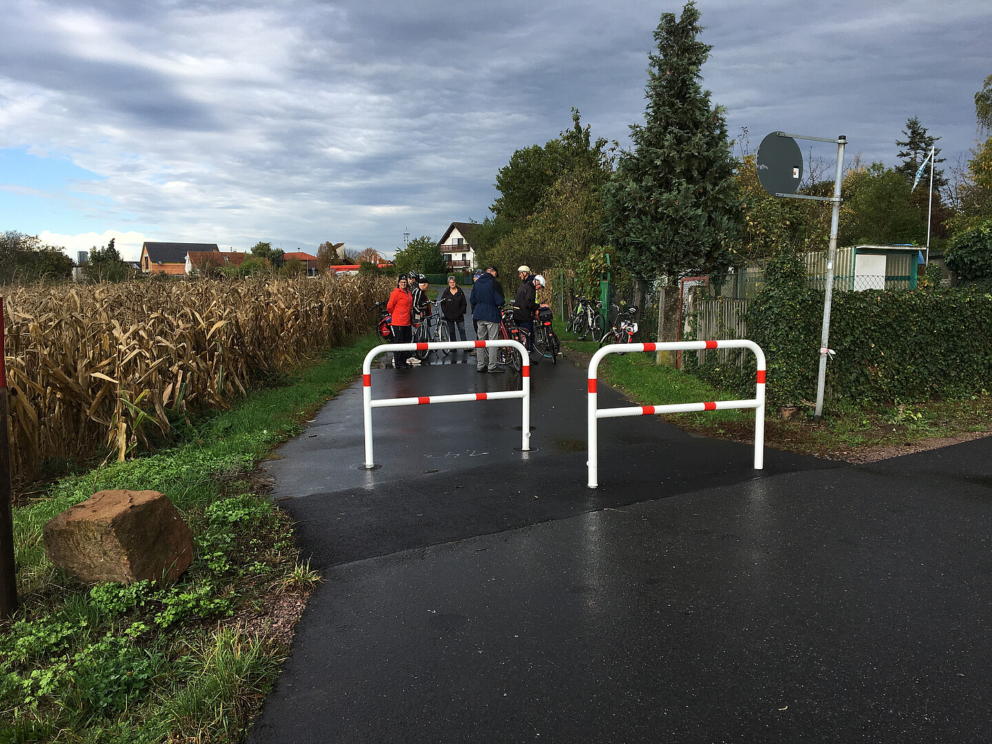 Nach Information der Gemeinde werden aktuell diese Sperrriegel gesetzt, um eine Befahrung durch Kraftfahrzeuge zu verhindern. Im Gegenzug wird dadurch der Radverkehr auf dem Mainradweg behindert. Dieser Radweg stellt in seinem Verlauf die am stärksten befahrene Radroute am bayerischen Untermain dar. Nach unseren Zählungen sind dort 200 bis 300 Radfahrer pro Stunde (!) nicht unüblich. Dieses Sperrinstrument auf dem stark genutzten Mainradweg ist in der Lage, den Rad- und Fußgängerverkehr beträchtlich zu behindern und gefährden. Die damit verursachte Verengung des Geh- und Radweges am Friedhof liegt zudem im Bereich einer unübersichtlichen und engen Kurve, so dass hier Radler im Gegenverkehr unversehens aufeinander treffen und gefährdet werden können. Außerdem ist der Absperrbügel in der Annäherung ein ernst zu nehmendes Hindernis, an dem Radler und insbesondere radende Kinder bei der Annäherung auffahren oder hängen bleiben und sich verletzen können.