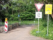 Zu der Überleitung vom Dreizehnmorgenweg zum Radweg entlang der B 8 hatte Dieter Stahlbock eine Eingabe in der Bürgerfragestunde gemacht und verschiedene Punkte zur Umleitung des Mainradweges thematisiert. Mittlerweile wurden die Sichtbeziehungen verbessert und vom Dreizehnmorgenweg kommend, ein Vorfahrt-Achten-Schild aufgestellt. Nachdem die Baumaßnahme bis 2031 dauert, hätten wir es als kostensparender gesehen, statt vorläufiger eine fest verbaute Beschilderung zu installieren. Hier ist bereits zu einem ersten Diebstahl gekommen. Ferner ist noch eine Metallplatte im Zufahrtsweg zur B 8 angebracht. Weshalb nun in dem von der Böschung befreiten Bereich Steinblöcke aufgestellt wurden, entzieht sich unserer Kenntnis.